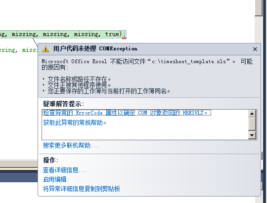 以前用代码读取Excel的时候从没有遇到过此错误,开始以为是权限问题,但是用普通的Console Application时却能够读取,放到web application里面就出现此错误: