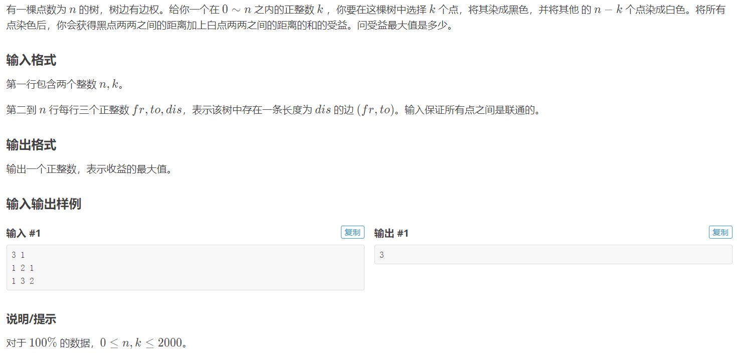 #include<bits/stdc++.h> #define int long long using namespace std; int n,m; int dp[2021][2021]; //i为根j个黑点 int head[4022],nxt[4022],to[4022],edge[4022]; int siz[2022]; int _; void add(int x,int y,int z) { _++; edge[_]=z; to[_]=y; nxt[_]=head[x]; head[x]=_; return ; } //看边经过次数 void makedp(int x,int fa) { siz[x]=1; dp[x][0]=0; dp[x][1]=0; //两种必然存在的结果 for(int i=head[x];i;i=nxt[i]) { int y=to[i]; if(y==fa) continue; makedp(y,x); siz[x]+=siz[y]; //减少范围,最多子树全是 黑点 for(int j=min(m,siz[x]);j>=0;j--) {//最多是儿子的子树全是 ,我们尝试去更新已知 for(int k=0;k<=min(j,siz[y]);k++) {//子树超了,状态不河狸 if(dp[x][j-k]==-1) continue; //edge[i]*k*(m-k) + edge[i]*(siz[y]-k)*(n-m-siz[y]+k) //边权*个数*个数(左右)(假设去染) +边权*子树个数*除这个子子树(未染) //当前点的j儿子=max(自身,儿子的dp值(有两个,黑/白)+) // 白, 黑 dp[x][j]=max(dp[x][j],dp[x][j-k]+dp[y][k]+edge[i]*k*(m-k)+edge[i]*(siz[y]-k)*(n-m-siz[y]+k)); } } } return ; } signed main() { ios::sync_with_stdio(false); cin>>n>>m; memset(dp,-1,sizeof(dp)); for(int i=1;i<n;i++) { int q,w,e; cin>>q>>w>>e; add(q,w,e); add(w,q,e); } makedp(1,0); //根节点1,有m个黑点 cout<<dp[1][m]; return 0; }