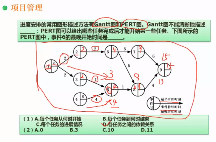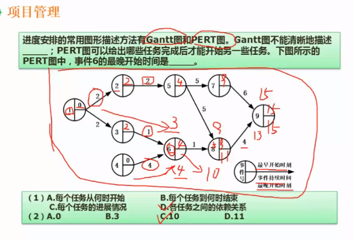 【要注意像事件6这种:有多个事件进行完毕,才能进行的下一个的事件的 最早开始时间】