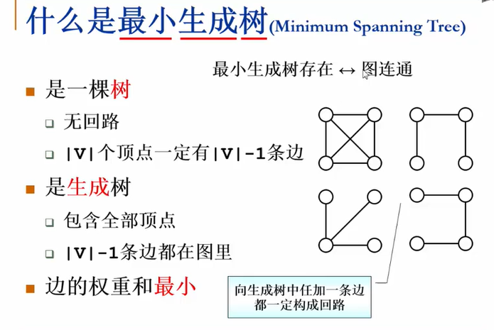 于是我们就可以引入连通图来解决我们遇到的问题,n个城市就是图上的n个顶点,然后,边表示两个城市的通信线路,每条边上的权重就是我们搭建这条线路所需要的成本,所以现在我们有n个顶点的连通网可以建立不同的生成树,每一颗生成树都可以作为一个通信网,当我们构造这个连通网所花的成本最小时,搭建该连通网的生成树,就称为最小生成树。