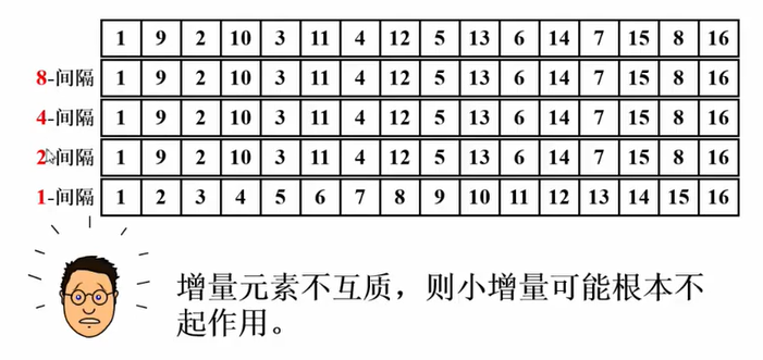 在上图这种情况下,以8/4/2为间隔都起不到交换的效果(因为在这些间隔上的数已经有序了),只有以1位间隔时才能真正地交换、排序(此时效率低下,还不如直接使用插入排序)