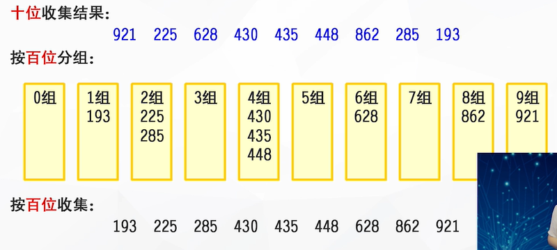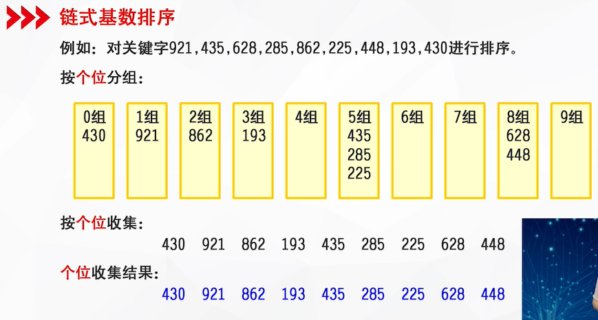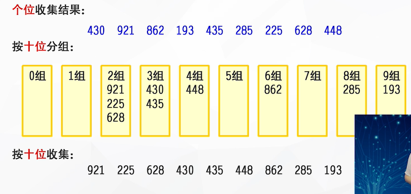 每个组内的数字顺序按上一轮的序列顺序进行排列(如果是第一趟则按开始的序列,之后第n趟则按n-1趟得到的序列进行排序)