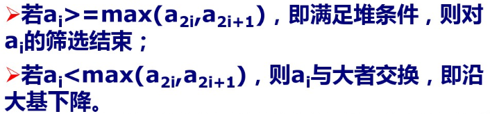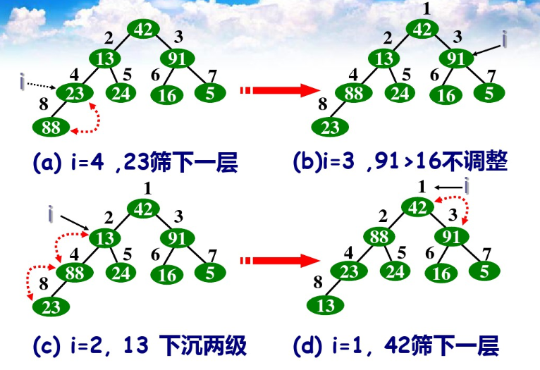 沿堆形自下向上,自右向左依次进行筛选(对堆中的各个元素位置进行调整)