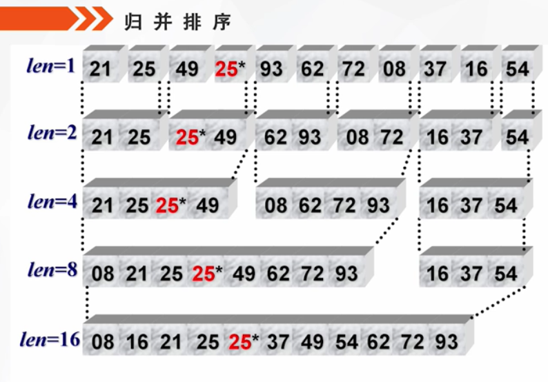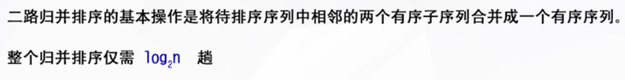 (一种基于分治、合并的排序;相比倾向于基于分治的快速排序,归并排序更倾向于简单地进行“分”,重在“合”的过程)