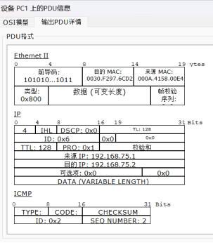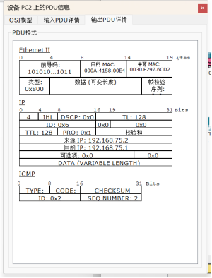 图中可见:pc1输出PDU的目的MAC和来源MAC和pc2输出PDU的MAC是相反的。