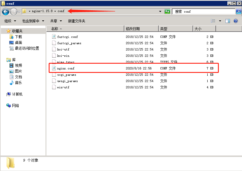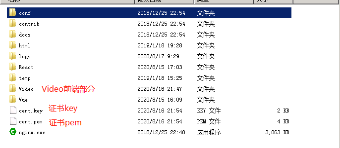 把下载的key和pem放在Nginx根目录下,部署视频聊天前端文件夹Video至根目录,打开conf文件夹下的nginx.conf文件并编辑