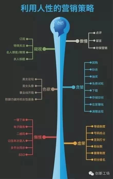 这一步才会涉及到我们常规的勋章、积分、等级、物质奖励、用户行为约束等。在建设具体的激励方式时,我们可以参考人性来进行设计:哪些是帮助用户炫耀来满足其虚荣心的?哪些是帮助用户降低使用成本来满足其懒惰的特性的?在这一步骤中,我们会发现可用的手段很多,包括利用人性的窥探隐私、色欲、贪婪、懒惰、虚荣、傲慢等;我引用了下方图片《利用人性的营销策略》(原出处未考证),该图从人性的角度做了基本的功能分类来对应相应的人性弱点,激励的满足手段也是相同的。
