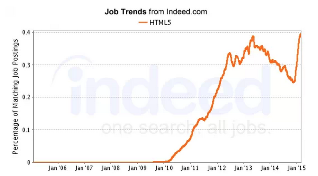 目前,HTML5 可以说是最热门的前端岗位了,在 2010 年和 2014 年底有两次爆发性增长,现在在美国的岗位需求甚至超过了 iOS。