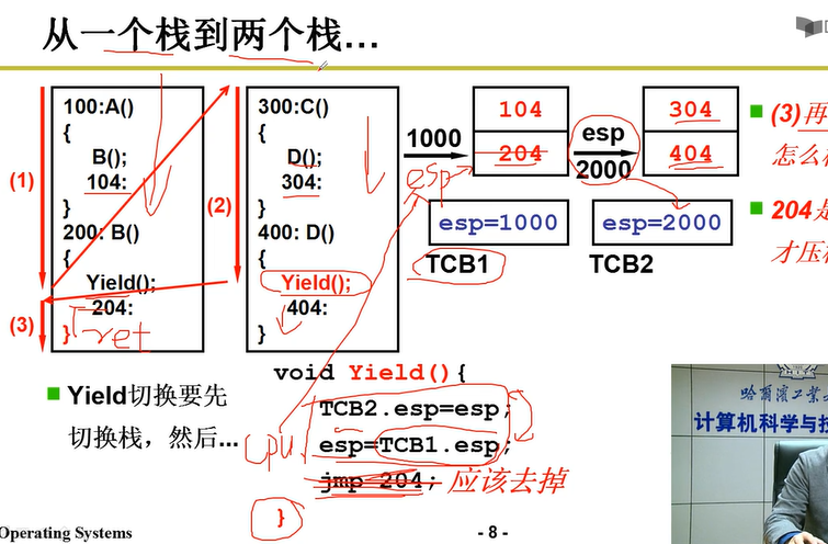Yield要做的一件重要的事情:切换栈,将当前栈保存到TCB当中。
