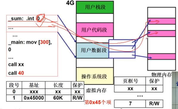 用户给出CS: IP,先查段表,访问某个段内的东西,得到一个虚拟地址;然后再查页表,得到物理地址。