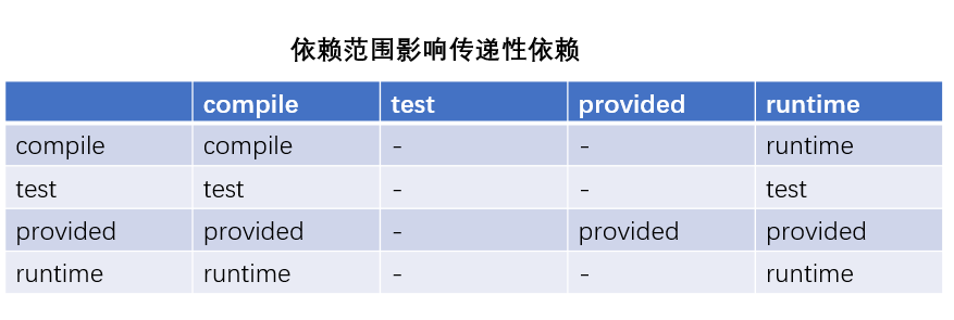 说明:第一列是第一直接依赖,第一行是第二直接依赖,除此之外就是传递性依赖的范围。