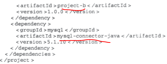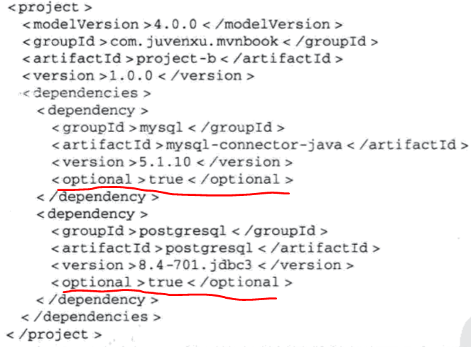 说明:使用<optional>元素标识mysql-connector-java和postgresql这两个依赖为可选依赖,它们只会对当前项目B产生影响,当其它项目依赖于B的时候,这两个依赖不会被传递。因此,当项目A依赖于项目B的时候,如果其实际使用基于Mysql数据库,那么在项目A中就需要显示地声明为mysql-connector-java这一依赖。见下:
