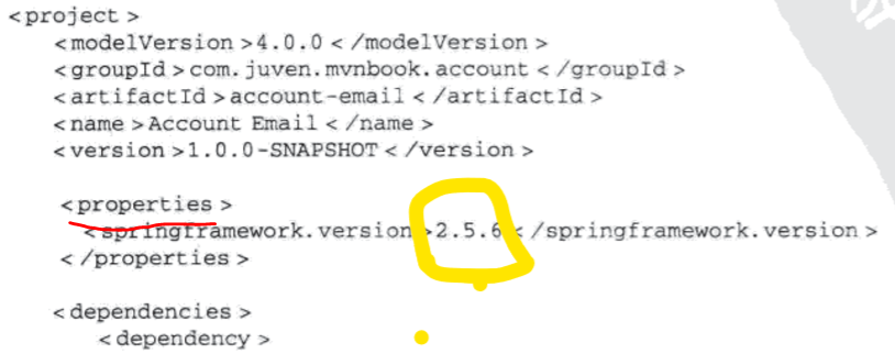 说明:首先使用properties元素定义Maven属性,然后在原型时候会将pom中的所有${springframework.version)替换成实际的值。