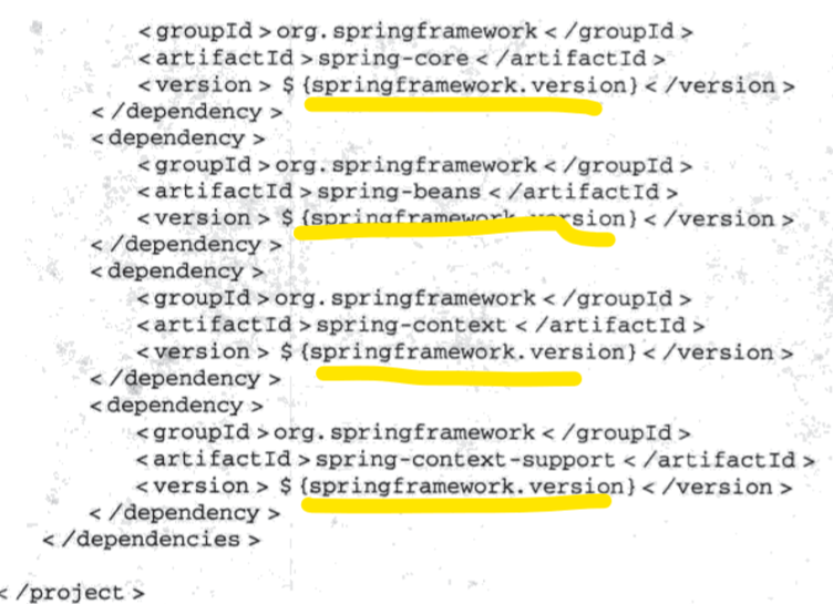 在升级Spring Framework时候,它所依赖的版本(core,beans等等)会一起升级。倘若我们在pom中每个jar写了版本,很容易写错,造成版本升级不兼容的问题。为了避免这种现象,可以采用JAVA编程当中的常量代替字面量的方式来解决。统一定义一个依赖版本,然后在不同的地方来引用就好了。
