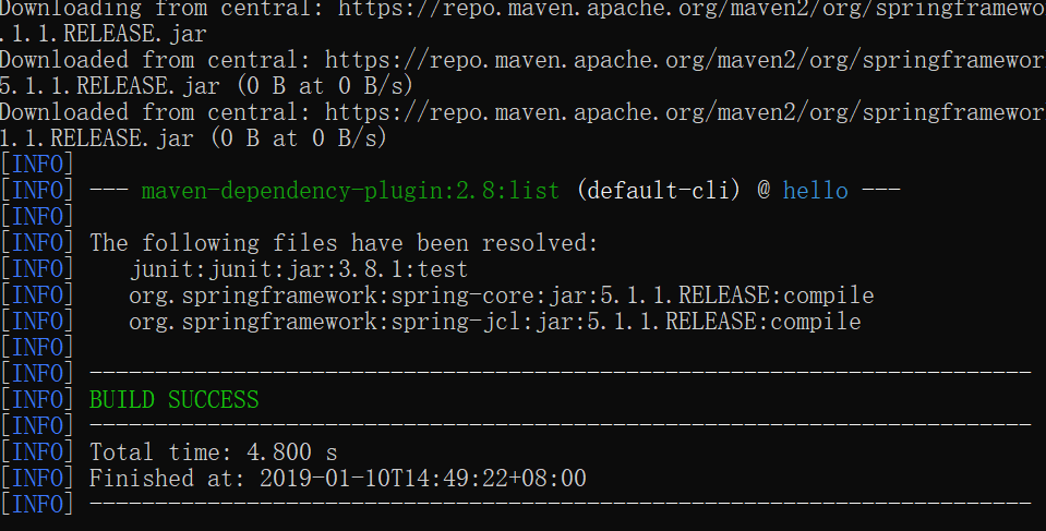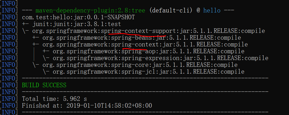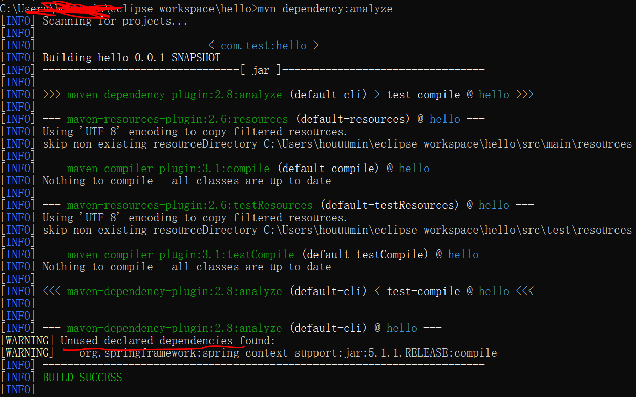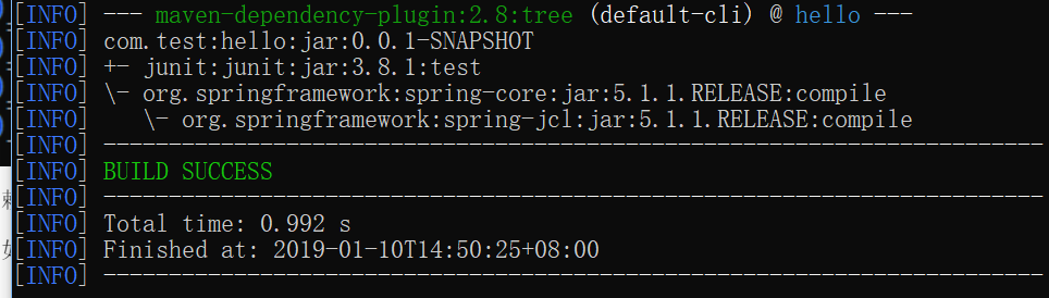 比如说项目中显示引入了spring-context和spring-context-support。现在删除spring-context,会发现项目编译、测试和打包都不会有任何问题。通过分析依赖树,可以看到spring-context是spring-context-support的依赖,因此会得以传递到项目的classpath中。先运行:mvn dependency:tree