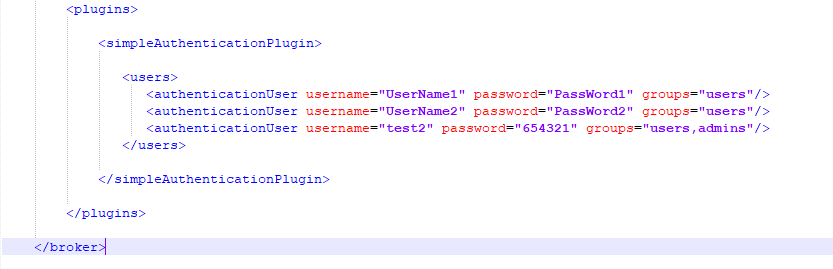 <plugins> <simpleAuthenticationPlugin> <users> <authenticationUser username="UserName1" password="PassWord1" groups="users"/> <authenticationUser username="UserName2" password="PassWord2" groups="users"/> <authenticationUser username="test2" password="654321" groups="users,admins"/> </users> </simpleAuthenticationPlugin> </plugins>