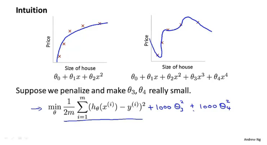 这里我们看到x3和x4两项导致了函数的过拟合,那么我们这个时候应当舍弃它们,也就是将θ3和θ4趋向于0。我们的做法就是在损失函数中给加上两个θ3和θ4的自带很大常数项的项,那么在训练的过程中, θ3和θ4由于常数项过大,就会自行缩小,逐渐逼近于0。