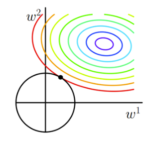 图中彩色多圈的圆是原来未加L2正则化项的损失函数,黑色的圆是正则化项(在这张二维图里就是α = w12 + w22)。与找到最低点(也就是图中的紫圈)不同的是,我们需要找到黑圈和彩圈的之和的最小值,如果这个时候再去找紫圈,那么经过紫圈的黑圈就会画的非常大,也就是α会非常大,那么二者的总和也就无法达到最小。为了达到折中的目的,可以证明(不知道怎么证明)两图恰好相交(相切)的某一个点就是总的loss最小的点。