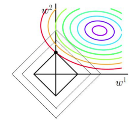 理由如上,可以找到最小值点。不难发现,一个有棱有角的图形和原来损失函数相切的点往往在坐标轴上(维度更高也是如此),这也就说明某些w在最优解的时候会是0,这也就是我们所说的稀疏解(稀疏解就是某些系数为0),这种模型的泛化能力一般更强(不过具体应用我还不知道)。