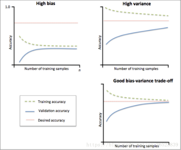 通过绘制学习曲线来判断是否过拟合,如图1,第一张图显示bias较大,准确率小于我们的期望准确率(也就是红色那条线),因此属于欠拟合;第二张图的训练准确率高于期望准确率,测试准确率低于期望值,而且两者差距较大,因此属于过拟合;第三张图做了很好的权衡,是合理的。