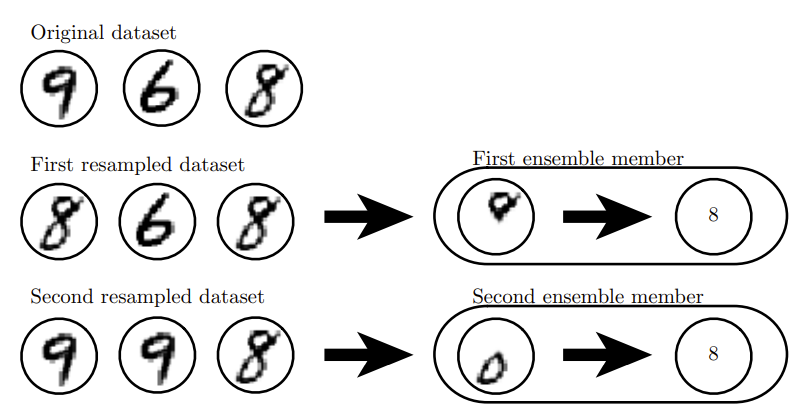“Bagging是通过结合几个模型降低泛化误差的技术。主要想法是分别训练几个不同的模型,然后让所有模型表决测试样例的输出。 这是机器学习中常规策略的一个例子,被称为模型平均(modelaveraging)。采用这种策略的技术被称为集成方法。模型平均(model averaging)奏效的原因是不同的模型通常不会在测试集上产生完全相同的误差。模型平均是一个减少泛化误差的非常强大可靠的方法。”