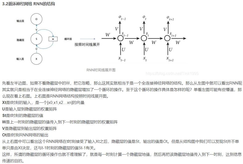 一段连续的信息,前后信息之间是有关系地,必须将不同时刻的信息放在一起理解。如果是普通的神经网络,每个输入之间是相互独立的,如果是RNN,则可以接收上一个输入传递的信息。如下图所示: