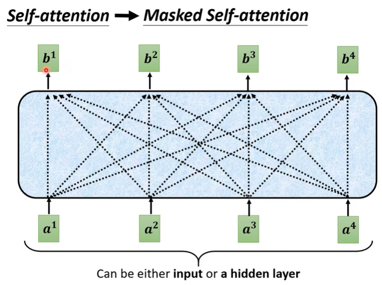 其他不同的是"Masked Multi-Head Attention",这里的Masked可以理解成同时输入与顺序输入,前者是a1a2a3a4都会影响b1b2b3b4,后者是b1只受a1影响,b2只受a1a2影响,以此类推。