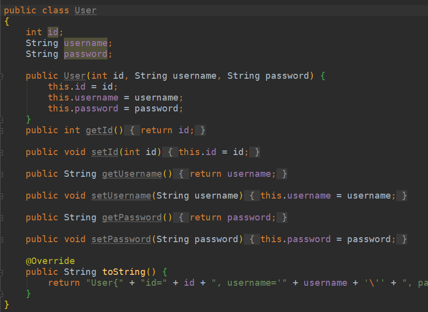 User这一个类就是建立数据实体,注意数据格式要和数据库中一一对应,先写出