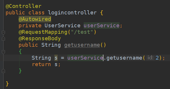 @ResponseBody 表示响应实体,加了这个之后, 底下方法里返回的值就会直接显示在浏览器界面上,就比如我在下面的getusername里面定义了一个String类型的s作为userService中getusername的值,表达的是