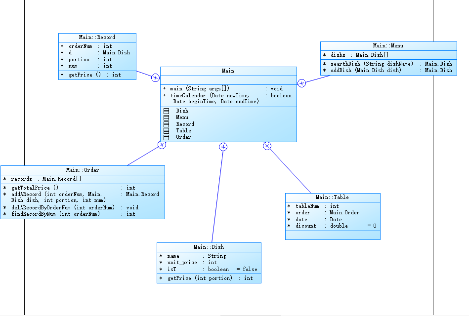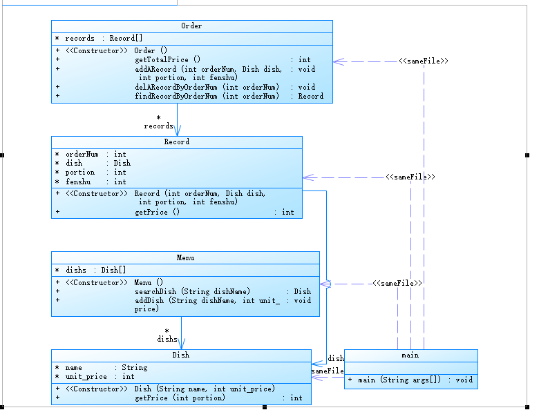 Order类:订单类,保存了用户点的所有菜的信息,包括订单上每一道的记录,可以计算订单的总价,添加、删除和查找一条记录。