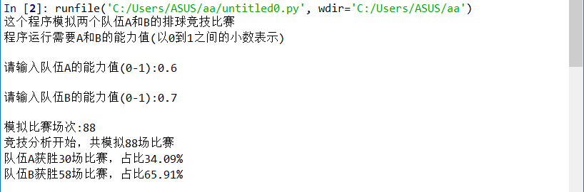 print('这个程序模拟两个队伍A和B的排球竞技比赛')