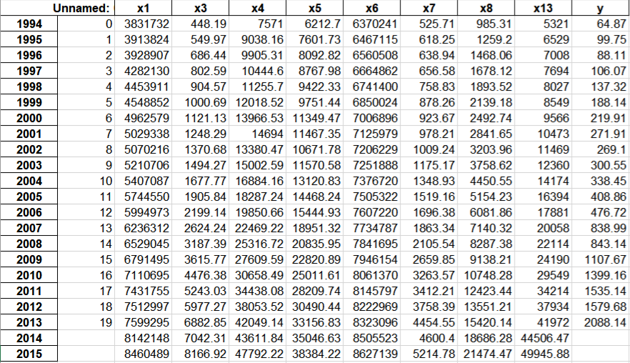 import sys sys.path.append('../code') # 设置路径 import numpy as np import pandas as pd from GM11 import GM11 # 引入自编的灰色预测函数 inputfile1 = '../tmp/new_reg_data.csv' # 输入的数据文件 inputfile2 = '../data/data.csv' # 输入的数据文件 new_reg_data = pd.read_csv(inputfile1,index_col=0) # 读取经过特征选择后的数据 data = pd.read_csv(inputfile2) # 读取总的数据 new_reg_data.index = range(1994, 2014) new_reg_data.loc[2014] = None new_reg_data.loc[2015] = None l = ['x1', 'x3', 'x4', 'x5', 'x6', 'x7', 'x8', 'x13'] for i in l: f = GM11(data[i][:20].values)[0] new_reg_data.loc[2014,i] = f(len(new_reg_data)-1) # 2014年预测结果 new_reg_data.loc[2015,i] = f(len(new_reg_data)) # 2015年预测结果 new_reg_data[i] = new_reg_data[i].round(2) # 保留两位小数 outputfile = 'new_reg_data_GM11.xls' # 灰色预测后保存的路径 y = list(data['y'].values) # 提取财政收入列,合并至新数据框中 y.extend([np.nan,np.nan]) new_reg_data['y'] = y new_reg_data.to_excel(outputfile) # 结果输出 print('预测结果为:\n',new_reg_data.loc[2014:2015,:]) # 预测结果展示