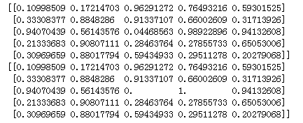 1 import numpy as np 2 a = np.random.rand(5,5) 3 m,n = a.shape 4 print(a) 5 a[int(np.argmax(a) / n) , int(np.argmax(a) % n)] = 1 6 a[int(np.argmin(a) / n) , int(np.argmin(a) % n)] = 0 7 print(a)
