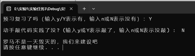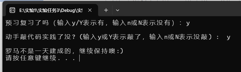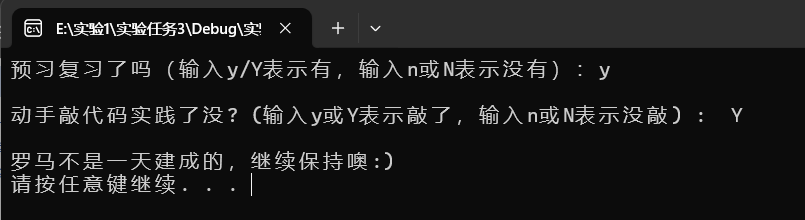 每个程序都要重复写头文件什么的,比较烦,我后面会在一个文件中提前编好框架,后面新建项目需要敲代码可以直接打开那个提前尊卑好的文件进行编写,还有运行框一闪而过的话是因为运行的太快了,可以加个system(“pausse”)(记得加头文件)这样就会停留在结果页面。这次实验让我对scanf的语法规则有了深刻理解,比如输入时的分隔符要严格遵守源代码中写的分隔符,比如实验4最后输入的3.2和4.6我源文件中分割号写的是逗号,我输入时分隔号也应该是逗号,不然就会结果就会错乱等等。