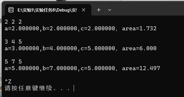 printf("a=%f,b=%f,c=%f,area=%.3f\n\n",a,b,c,p);