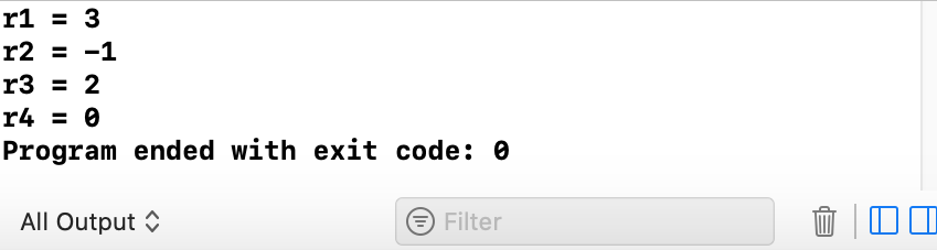 #include <stdio.h> int main() { int x,y; int r1,r2,r3,r4; x=1; y=2; r1 = x + y; r2 = x - y; r3 = x * y; r4 = x / y; printf("r1 = %d\n", r1); printf("r2 = %d\n", r2); printf("r3 = %d\n", r3); printf("r4 = %d\n", r4);// 在屏幕上输出r1,r2,r3,r4中存放的结果 return 0; }