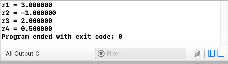 #include <stdio.h> int main() { float x,y; float r1,r2,r3,r4; x=1; y=2; r1 = x + y; r2 = x - y; r3 = x * y; r4 = x / y; printf("r1 = %f\n", r1); printf("r2 = %f\n", r2); printf("r3 = %f\n", r3); printf("r4 = %f\n", r4);// 在屏幕上输出r1,r2,r3,r4中存放的结果 return 0; }