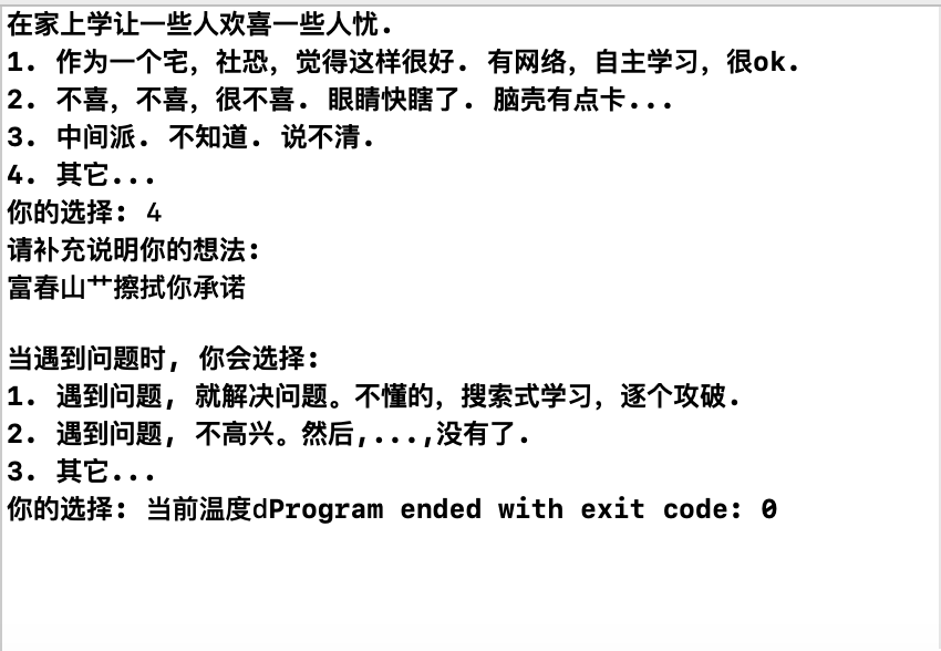 // 测试你是哪一类学习者 #include <stdio.h> int main() { int answer; char words[5000]; printf("在家上学让一些人欢喜一些人忧.\n"); printf("1. 作为一个宅,社恐,觉得这样很好. 有网络,自主学习,很ok.\n"); printf("2. 不喜,不喜,很不喜. 眼睛快瞎了. 脑壳有点卡...\n"); printf("3. 中间派. 不知道. 说不清.\n"); printf("4. 其它...\n"); printf("你的选择: "); scanf("%d", &answer); if(answer == 4) { printf("请补充说明你的想法: \n"); getchar(); // 先别管 fgets(words,90,stdin); // 输想法 } printf("\n"); printf("当遇到问题时, 你会选择:\n"); printf("1. 遇到问题, 就解决问题。不懂的,搜索式学习,逐个攻破.\n"); printf("2. 遇到问题, 不高兴。然后,...,没有了.\n"); printf("3. 其它...\n"); printf("你的选择: "); scanf("%d", &answer); if(answer == 1) printf(":)\n"); else if(answer == 2) printf("这样不能解决问题啊...我们选择1好不好:)\n"); else if(answer == 3) { printf("请补充说明你的想法: \n"); getchar(); // -不用管 fgets(words,90,stdin); //输完敲回车键 } return 0; }