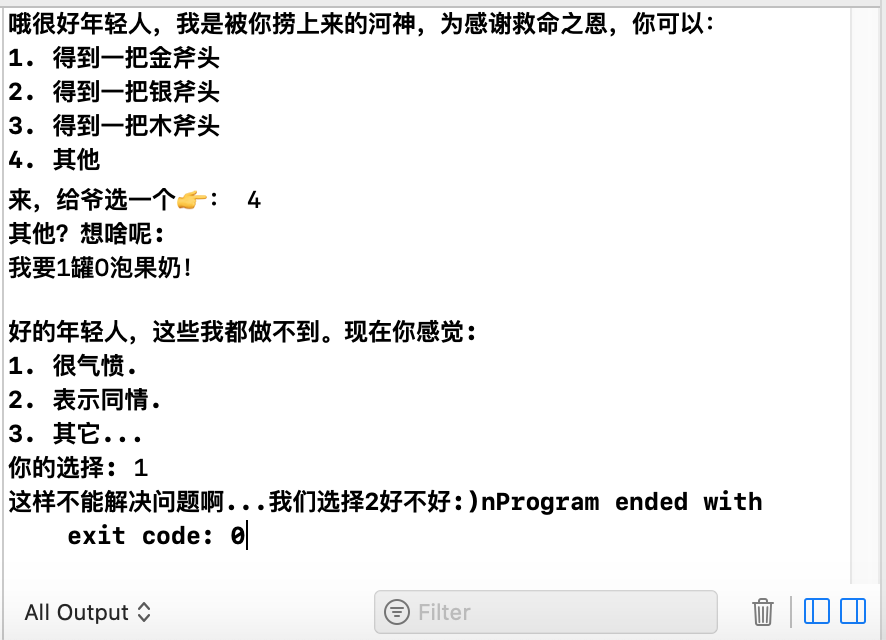 #include <stdio.h> int main() { int answer; char words[5000]; printf("哦很好年轻人,我是被你捞上来的河神,为感谢救命之恩,你可以:\n"); printf("1. 得到一把金斧头\n"); printf("2. 得到一把银斧头\n"); printf("3. 得到一把木斧头\n"); printf("4. 其他\n"); printf("来,给爷选一个👉: "); scanf("%d", &answer); if(answer == 4) { printf("其他?想啥呢: \n"); getchar(); // 别管 fgets(words,100,stdin); // 输入想法 } printf("\n"); printf("好的年轻人,这些我都做不到。现在你感觉:\n"); printf("1. 很气愤.\n"); printf("2. 表示同情.\n"); printf("3. 其它...\n"); printf("你的选择: "); scanf("%d", &answer); if(answer == 1) printf("这样不能解决问题啊...我们选择2好不好:)n"); else if(answer == 2) printf("那下次再见\n"); else if(answer == 3) { printf("请补充说明你的想法: \n"); getchar(); // 别管 fgets(words,100,stdin); // 输完敲回车 } return 0; }