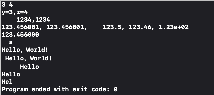 #include<stdio.h> int main(){ int x=1234; float f=123.456; double m=123.456; char ch='a'; char a[]="Hello,World!"; int y=3,z=4; printf("%d %d\n",y,z); printf("y=%d,z=%d\n",y,z); printf("%8d,%2d\n",x,x); printf("%f, %8f, %8.1f, %0.2f, %.2e\n",f,f,f,f,f); printf("%lf\n",m); printf("%3c\n",ch); printf("%s\n%15s\n%10.5s\n%2.5s\n%.3s\n",a,a,a,a,a); return 0; }