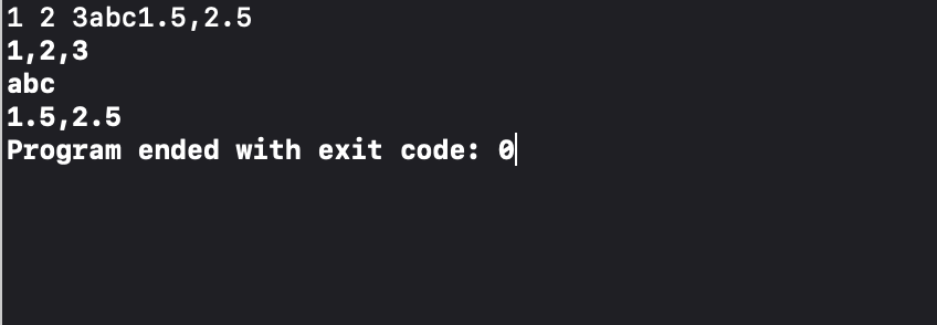 #include <stdio.h> int main() { double x,y; char c1,c2,c3; int a1,a2,a3; scanf("%d%d%d",&a1,&a2,&a3); printf("%d,%d,%d\n",a1,a2,a3); scanf("%c%c%c",&c1,&c2,&c3); printf("%c%c%c\n",c1,c2,c3); scanf("%lf,%lf",&x,&y); printf("%.1f,%.1lf\n",x,y); return 0; }