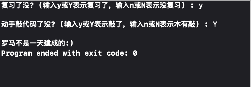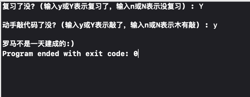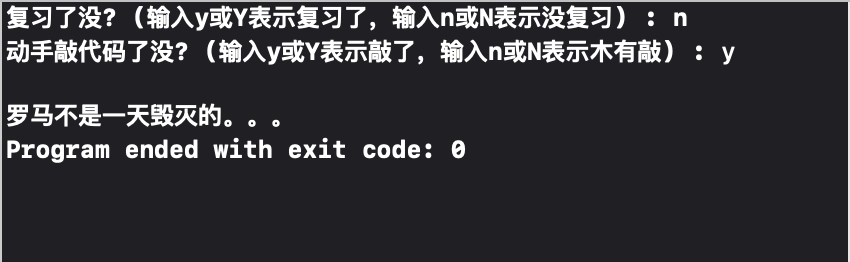 #include <stdio.h> int main() { char ans1, ans2; printf("复习了没? (输入y或Y表示复习了,输入n或N表示没复习) : "); ans1 = getchar(); // 从键盘输入一个字符,赋值给ans1 getchar(); // 思考这里为什么要加这一行。试着去掉这一行,看看对运行有没有影响。 printf("\n动手敲代码了没? (输入y或Y表示敲了,输入n或N表示木有敲) : "); ans2 = getchar(); if((ans1=='y'||ans1=='Y')&&(ans2=='y'||ans2=='Y'))//待补足,判断用户回答ans1和ans2都是小写y或大写Y printf("\n罗马不是一天建成的:)\n"); else printf("\n罗马不是一天毁灭的。。。\n"); return 0; }