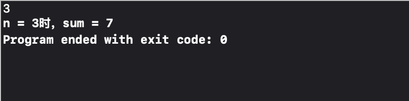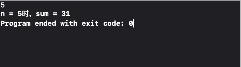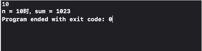 #include <stdio.h> int mama(int x); int main() { int n,sum=0; scanf("%d",&n); for(int i=0;i<n;i++){ //循环:从i=0开始,求2^0+2^1+···+2^(n-1) sum+=mama(i); } printf("n = %d时,sum = %d\n",n,sum); return 0; } int mama(int x){ //mama函数是:输入x,得到2的x次方 int sum=1; for(int i=0;i<x;i++)sum*=2; if (x==0)sum=1; return sum; }