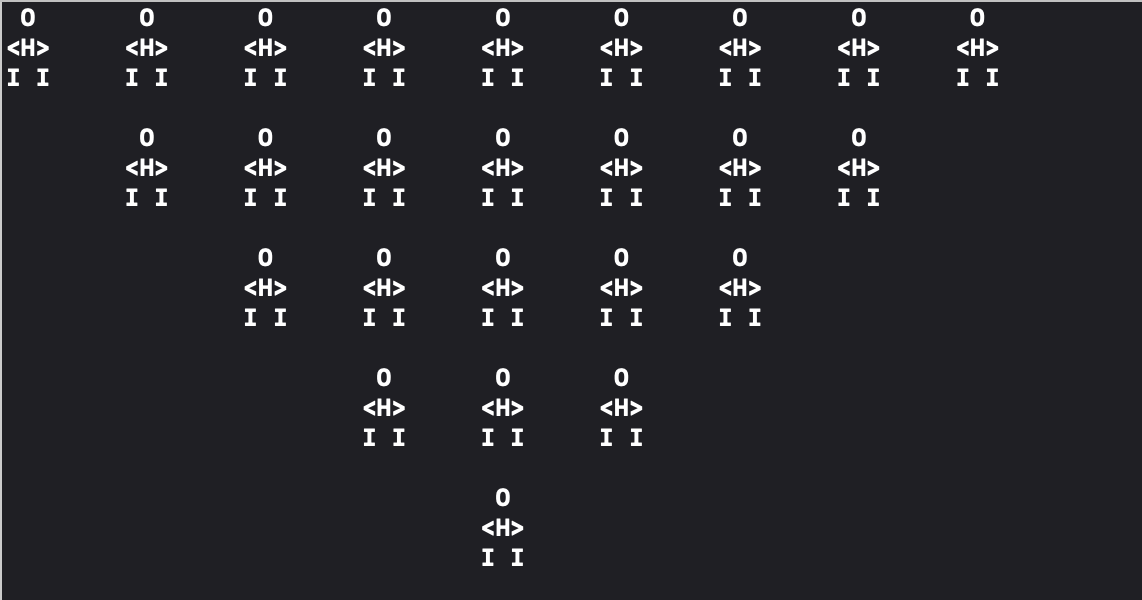 #include <stdio.h> int main(int argc, const char * argv[]) { for(int i=0;i<5;i++){ for(int j=0;j<i;j++){ //打空格 printf("\t\t"); } for(int j=0;j<9-2*i;j++){ //这个for打一行O printf(" O \t\t"); }printf("\n"); for(int j=0;j<i;j++){ //打空格 printf("\t\t"); } for(int j=0;j<9-2*i;j++){ //这个for打一行<H> printf("<H>\t\t"); }printf("\n"); for(int j=0;j<i;j++){ //打空格 printf("\t\t"); } for(int j=0;j<9-2*i;j++){ //这个for打一行I I printf("I I\t\t"); }printf("\n\n"); } return 0; }