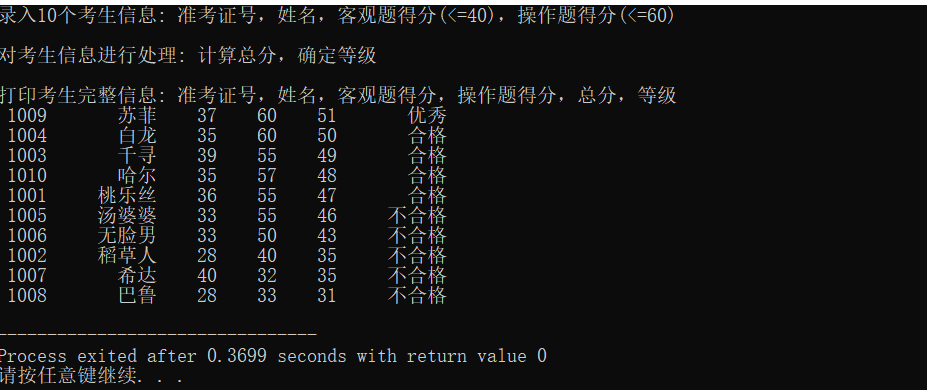 printf("\n打印考生完整信息: 准考证号,姓名,客观题得分,操作题得分,总分,等级\n");