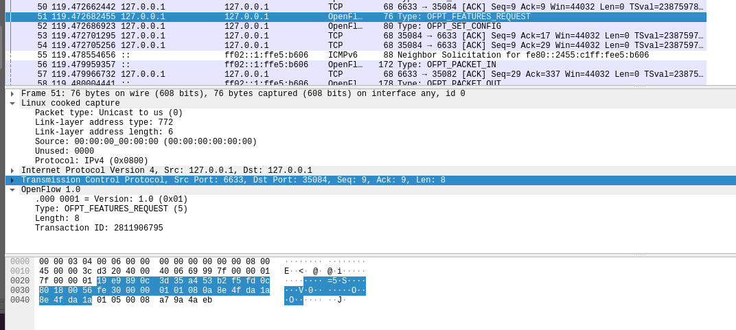 分析抓取的flow_mod数据包,控制器通过6633端口向交换机35084端口