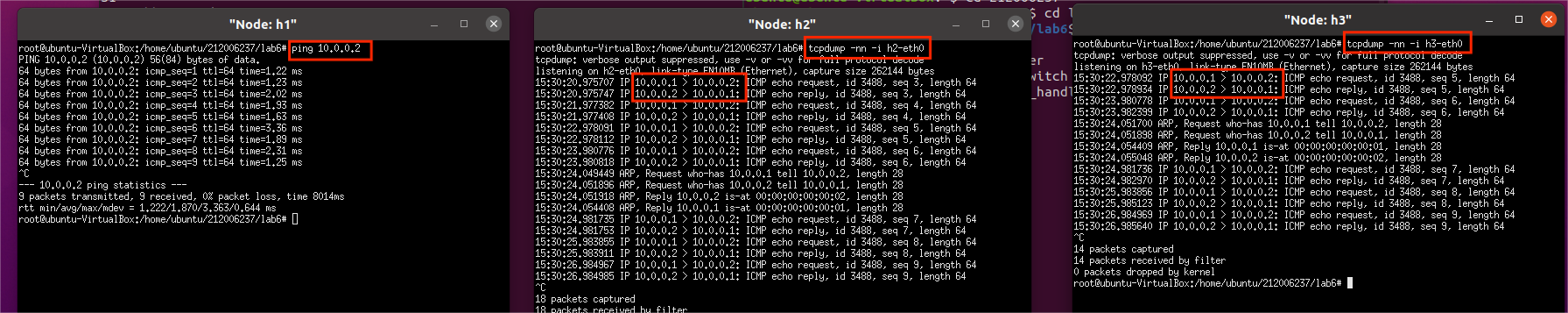 2.阅读Ryu文档的The First Application一节,运行当中的L2Switch,h1 ping h2或h3,在目标主机使用 tcpdump 验证L2Switch,分析L2Switch和POX的Hub模块有何不同。