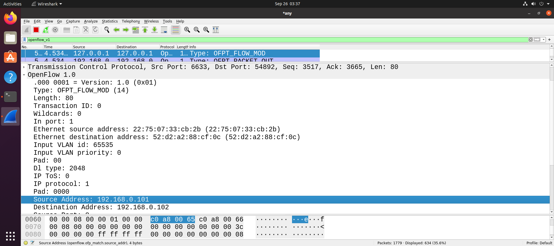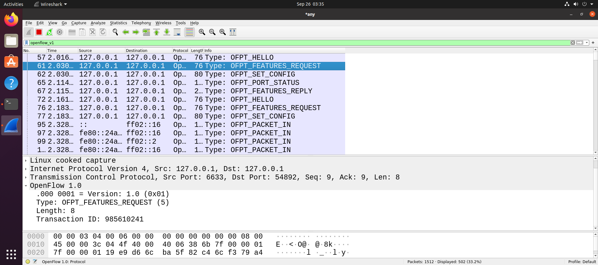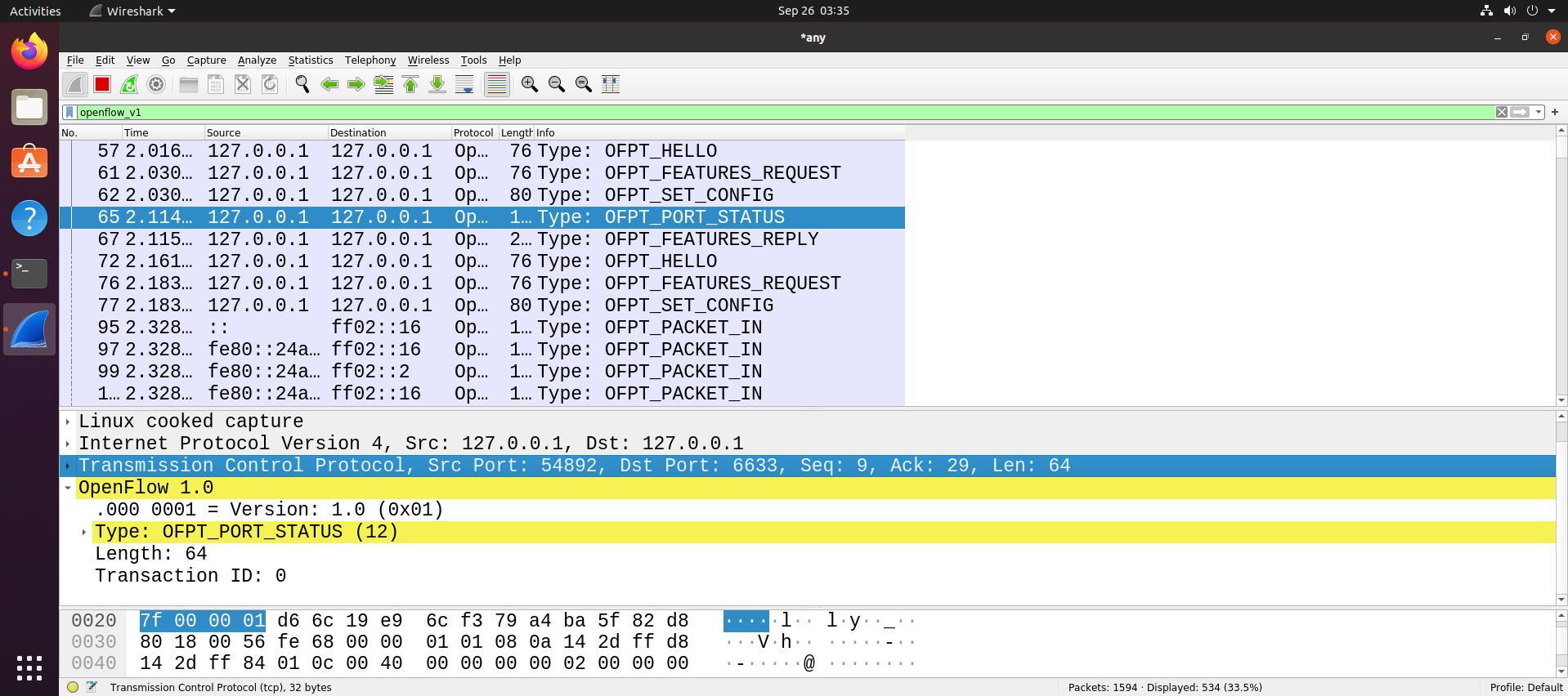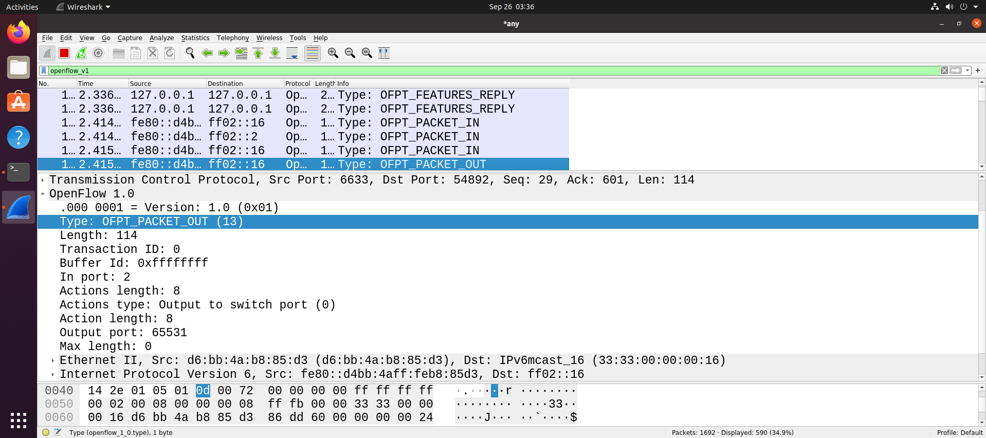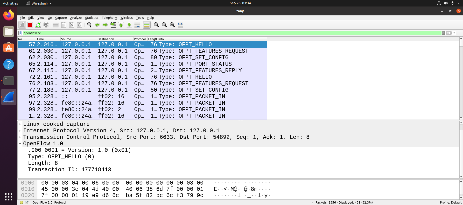 - 能够运用 wireshark 对 OpenFlow 协议数据交互过程进行抓包;