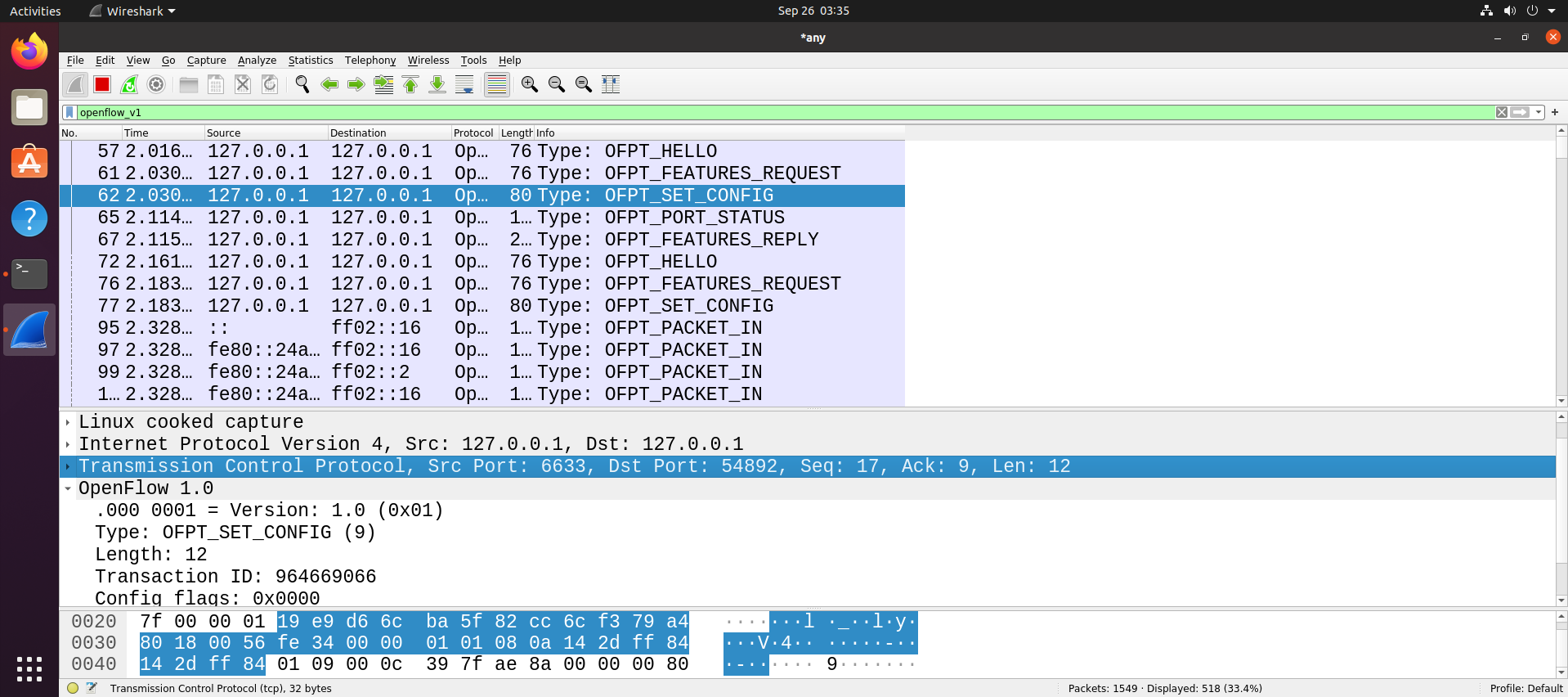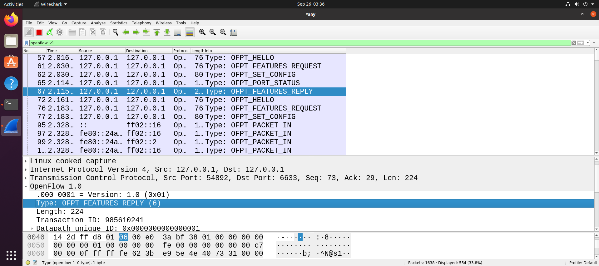 - 找不到54892端口发给6633的hello报文,通过将过滤条件设置为openflow_v6得以解决。