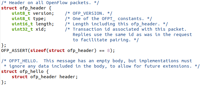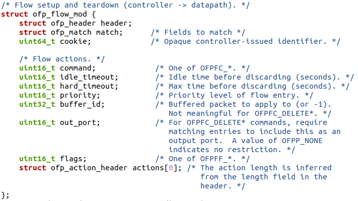 struct ofp_packet_in { struct ofp_header header; uint32_t buffer_id; /* ID assigned by datapath. */ uint16_t total_len; /* Full length of frame. */ uint16_t in_port; /* Port on which frame was received. */ uint8_t reason; /* Reason packet is being sent (one of OFPR_*) */ uint8_t pad; uint8_t data[0]; /* Ethernet frame, halfway through 32-bit word, so the IP header is 32-bit aligned. The amount of data is inferred from the length field in the header. Because of padding, offsetof(struct ofp_packet_in, data) == sizeof(struct ofp_packet_in) - 2. */ };